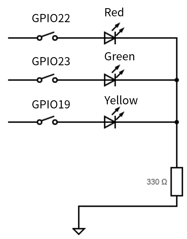 The GPIO pins 22, 23, and 19 control the red, green, and yellow LEDs respectively. 330 ohms resistors are connected in series at the end to prevent the LEDs from burning out due to excessive current.