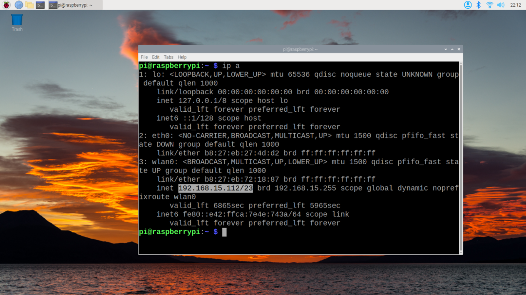 At this point, the SSH service is on, but we need to know the IP of the Raspberry Pi in order to SSH, so we can check it with the built-in ip addr command.