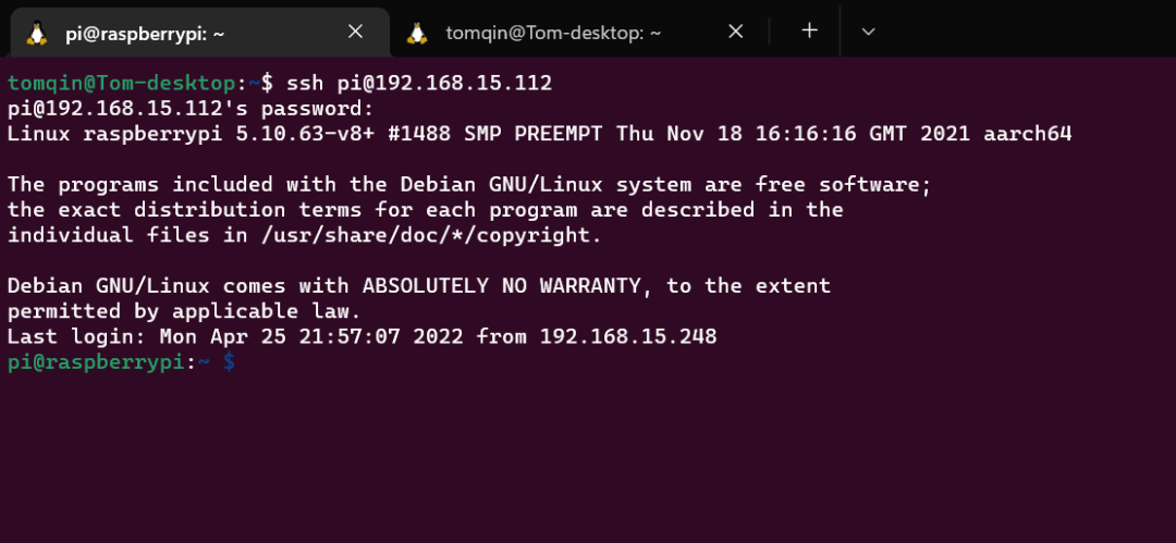 Back in the computer, you can remotely access the Raspberry Pi from the command line via ssh pi@192.168.15.122