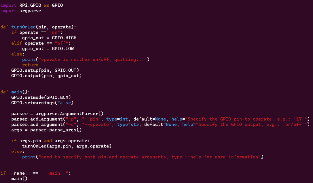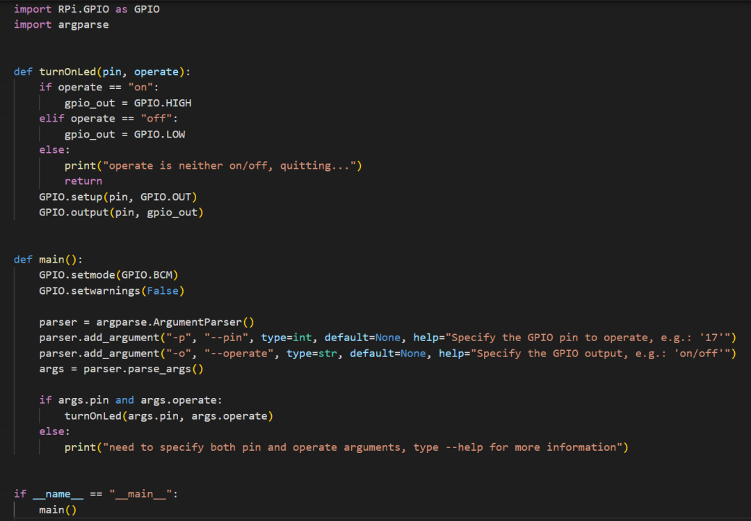 Next we need to handle errors, passing the arguments into the function turnOnLed to operate when the pin count and operation are not empty, otherwise printing a warning