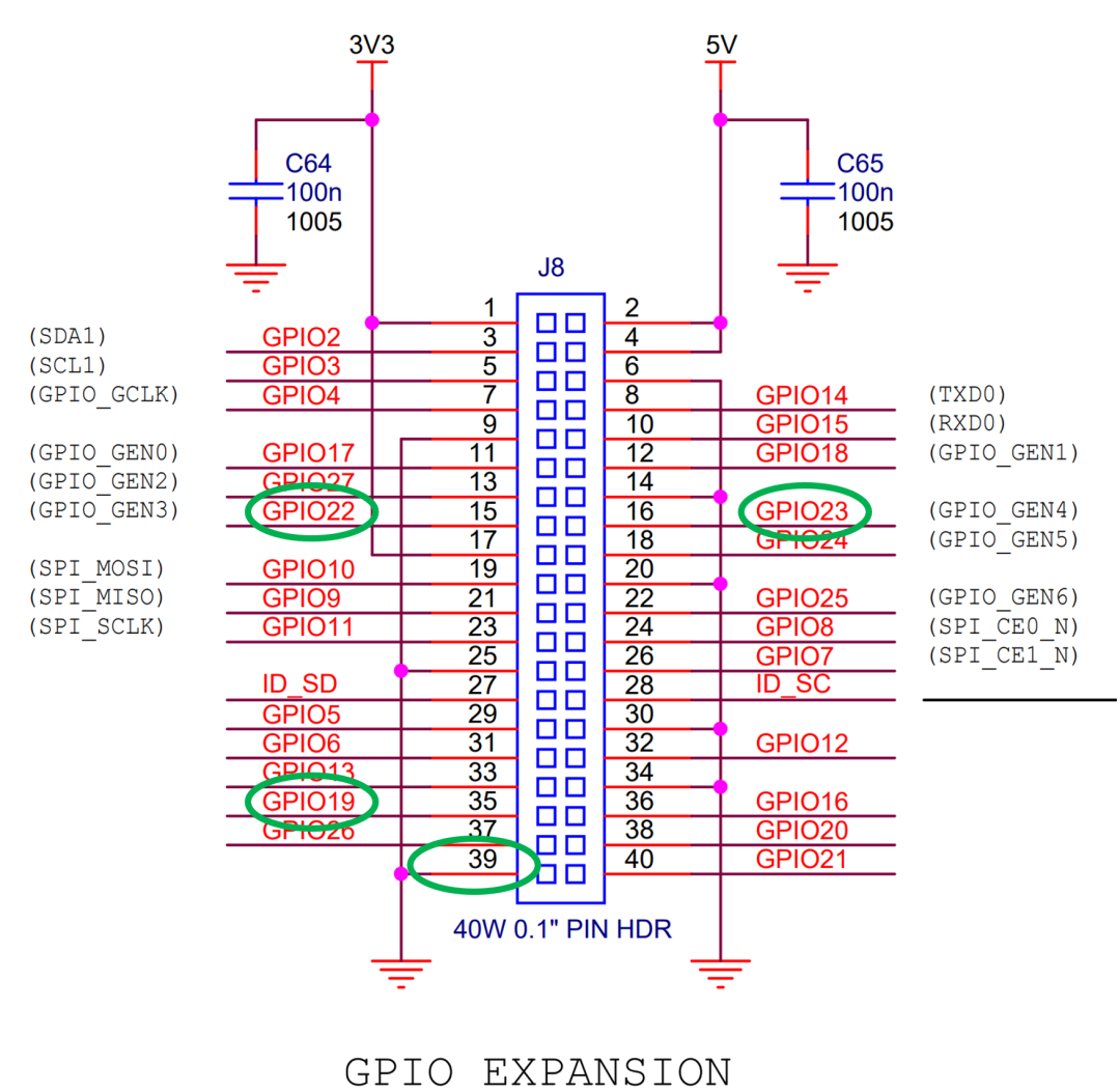 According to the Pin Layout in the official Raspberry Pi documentation, we can see the exact location of the pins, here pins 15, 16, 35 and 39 are used.