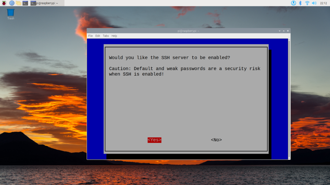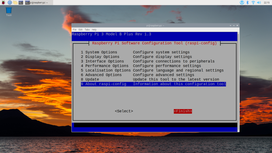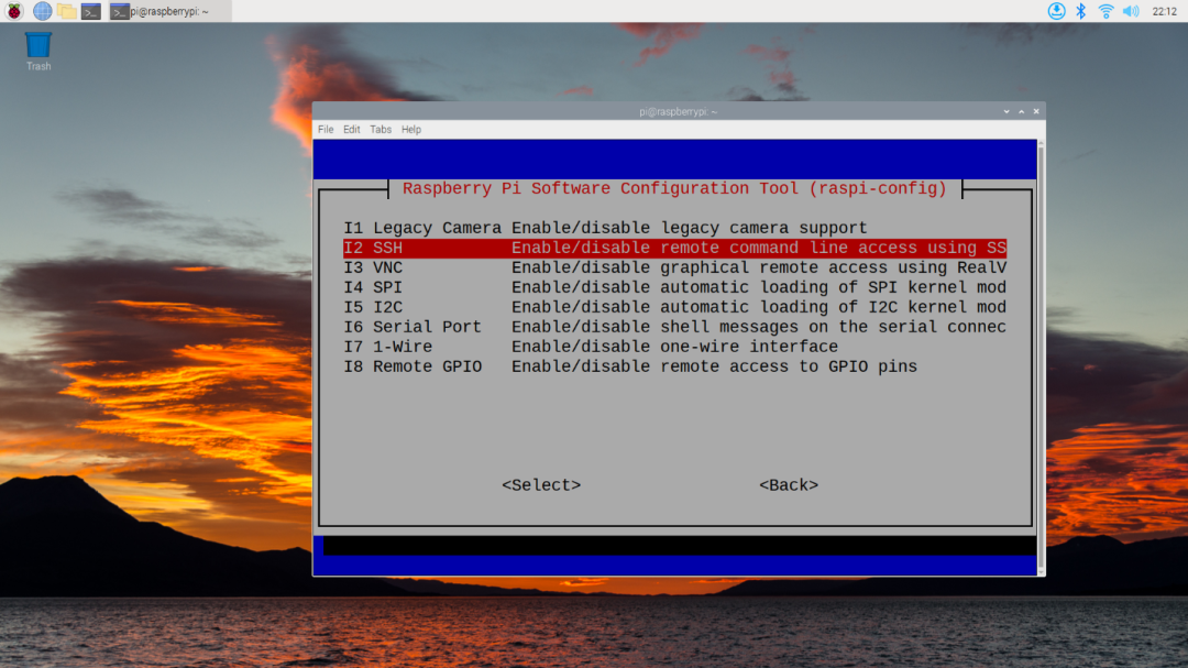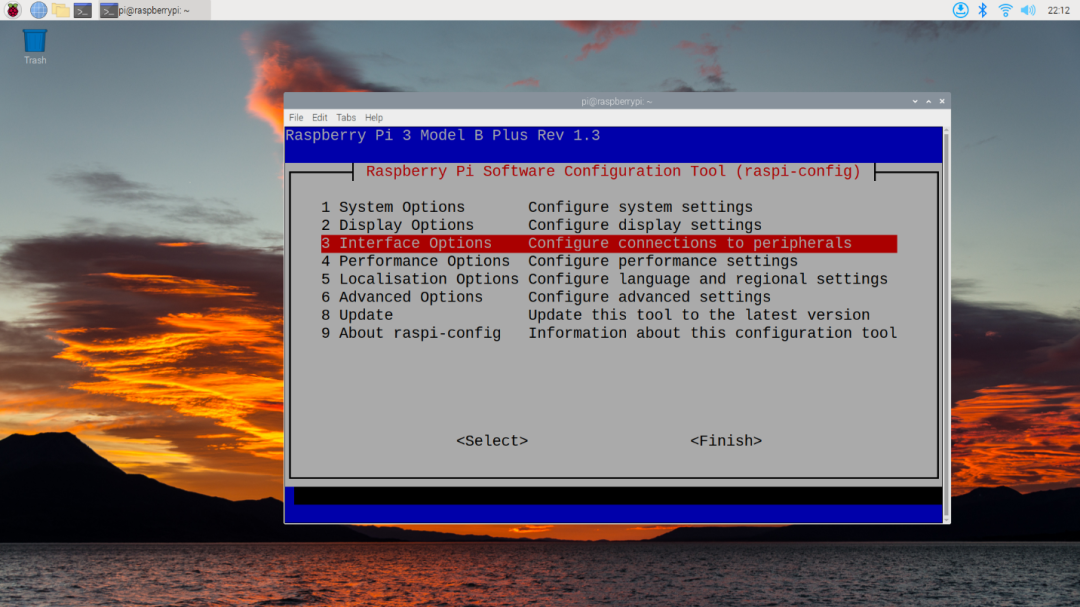 First, for development/debugging we need to enable SSH, open a terminal from the desktop and enter sudo raspi-config to access the configuration screen and select Interface Options.