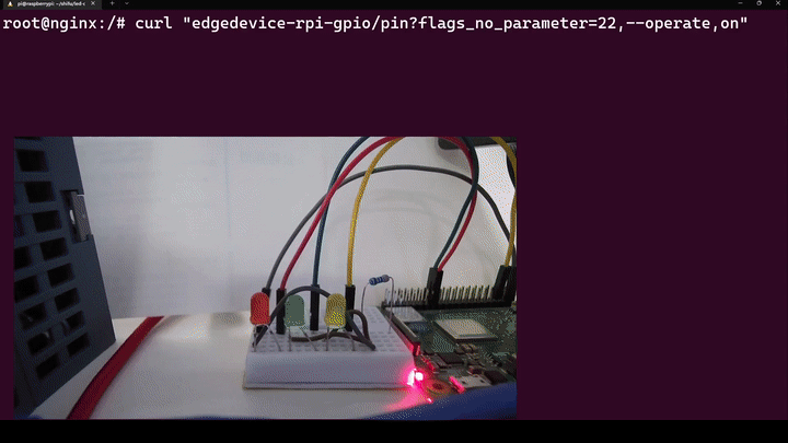 Using Shifu to send commands will convert from HTTP to command line, the request address is written as: http://edgedevice-rpi-gpio/pin?flags_no_parameter=<pin>,--operate,<on/off>